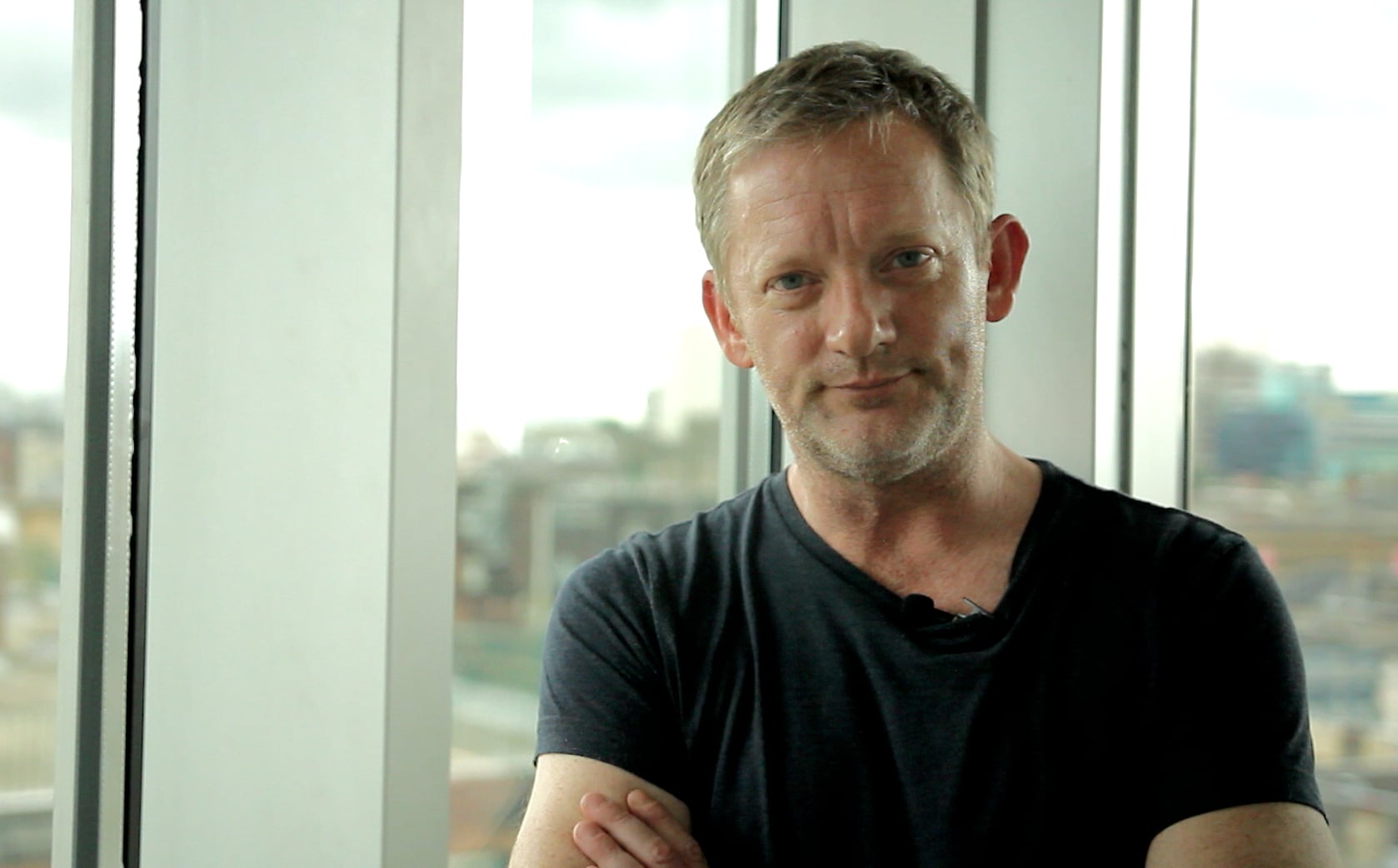 Description: A man standing in front of a window with a city view behind him and a glass wall behind him.