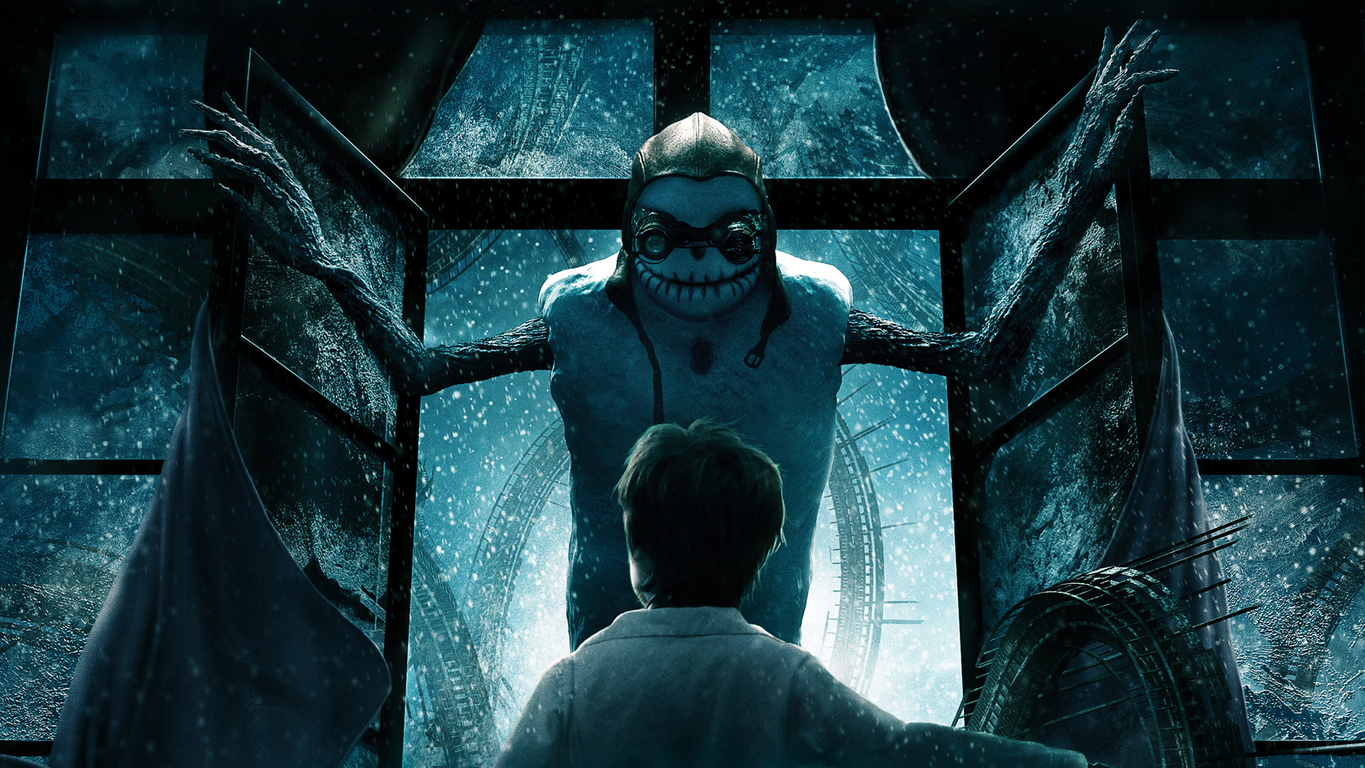 Description: A man standing in front of a window next to a creepy man in a white shirt and a creepy mask.