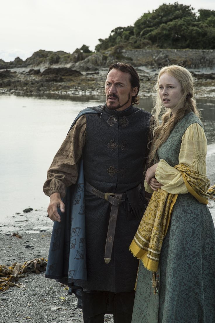 Description: A man and a woman standing next to each other on a beach near water and trees in the background.