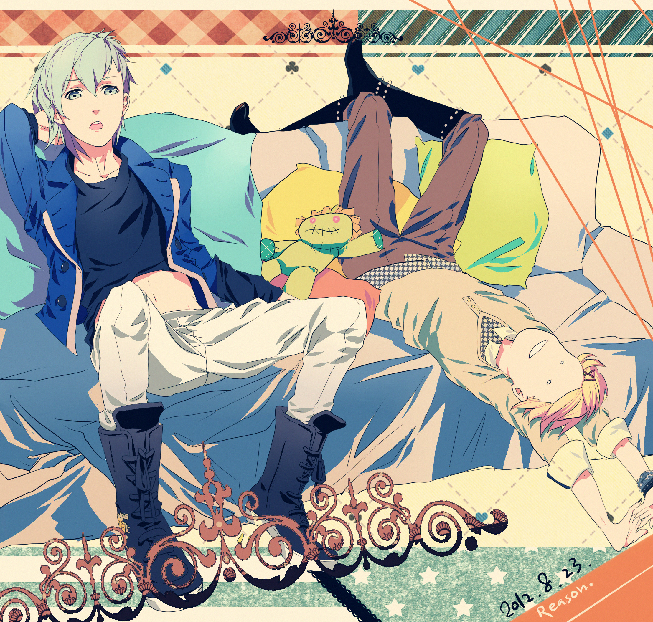 Description: A man and a woman laying on a bed together with a cat on the bed behind them and a cat on the bed behind them.