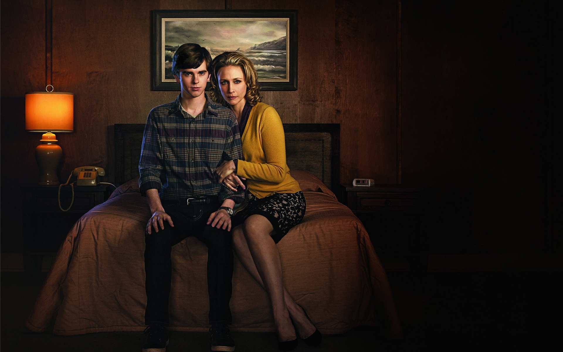 Description: A man and a woman sitting on a bed in a room with a painting on the wall behind them.