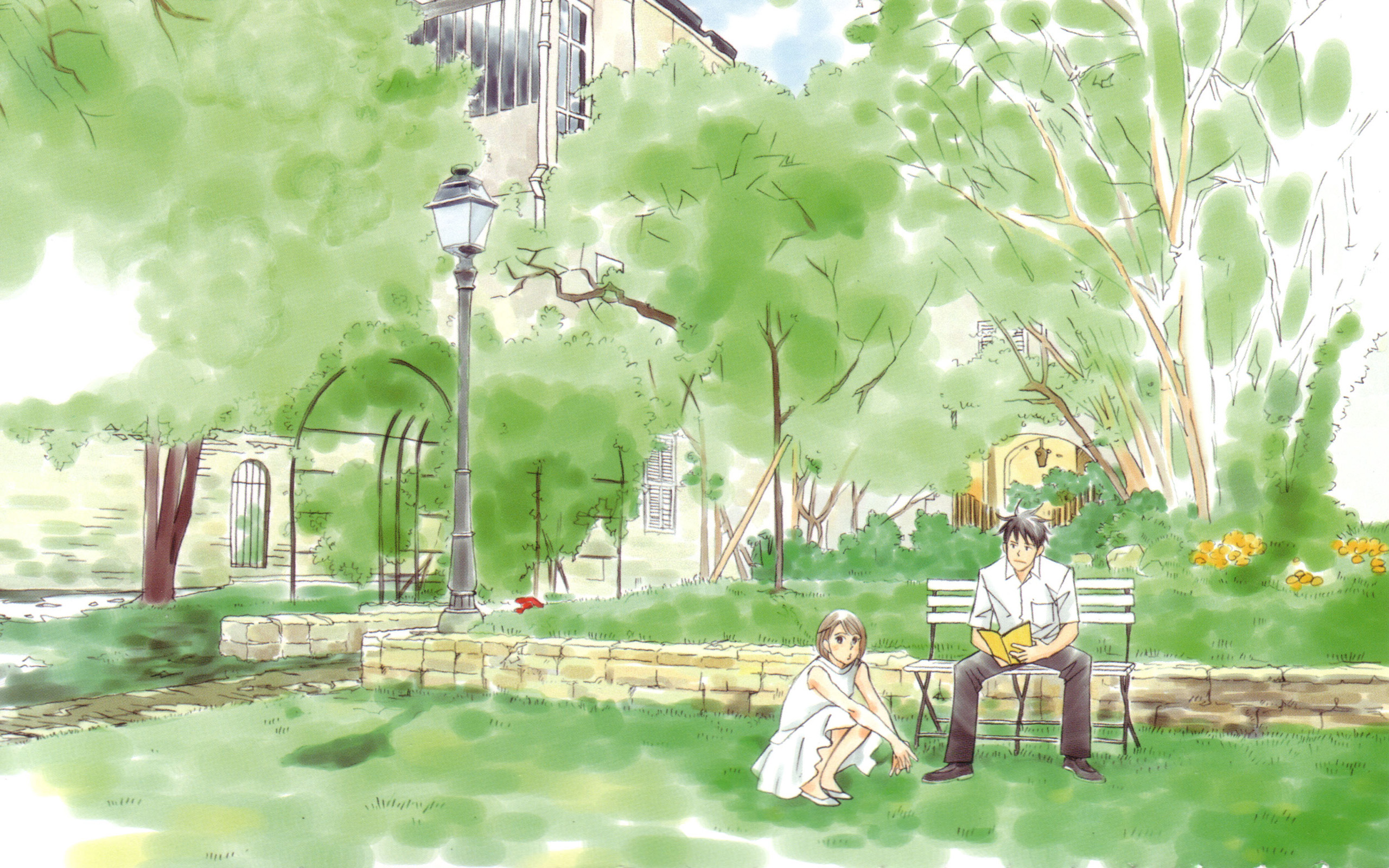 Description: A man and woman sitting on a bench in a park next to a tree and a lamp post with a building in the background.