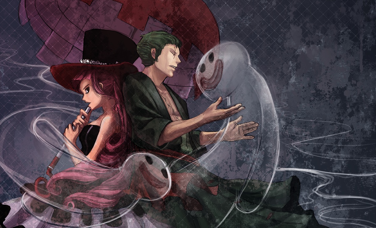 Description: A man and a woman sitting on a bench in the rain with a ghost behind them and a red umbrella.