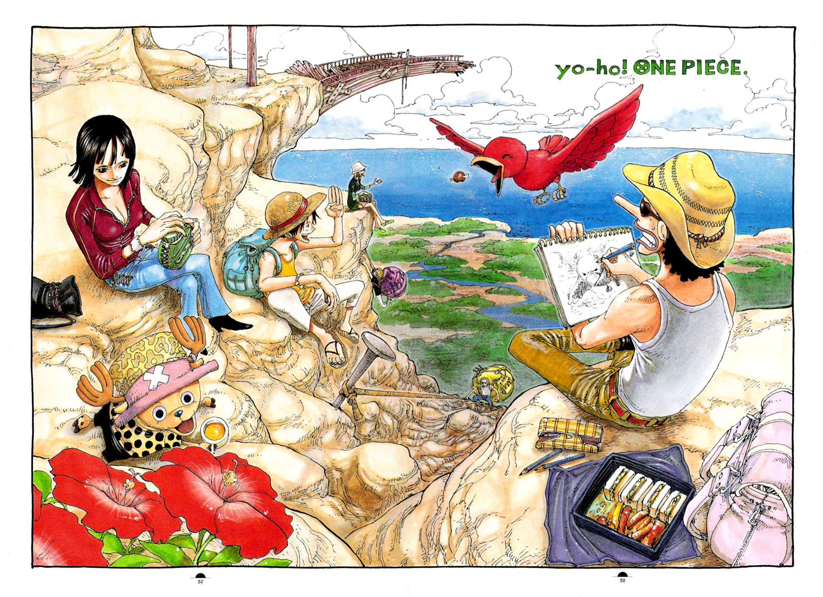 Description: A drawing of a man and woman sitting on a rock with a bird flying over them and a bird flying over them.