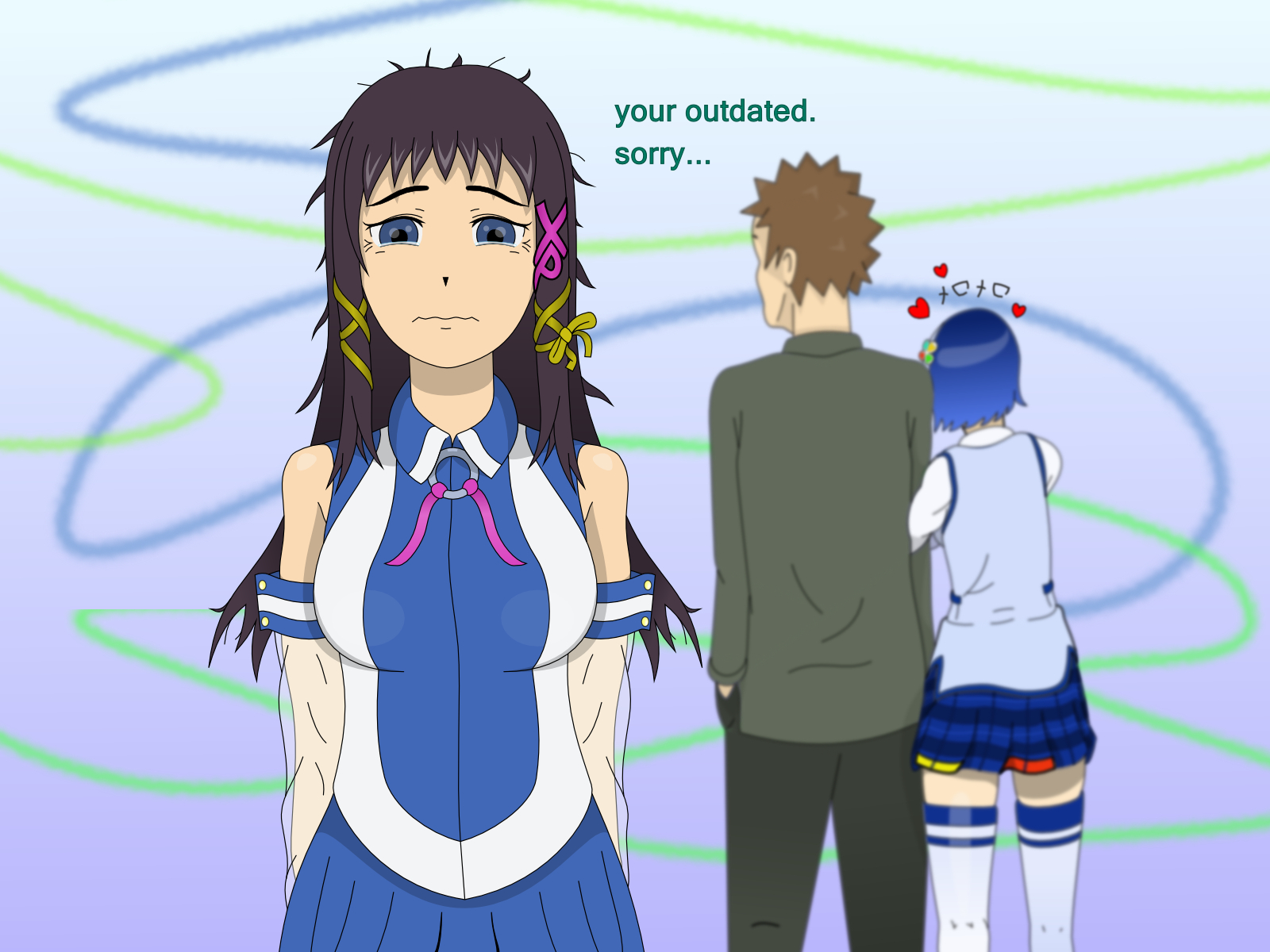 Description: A man and a woman standing next to each other in front of a blue background with a message that reads.