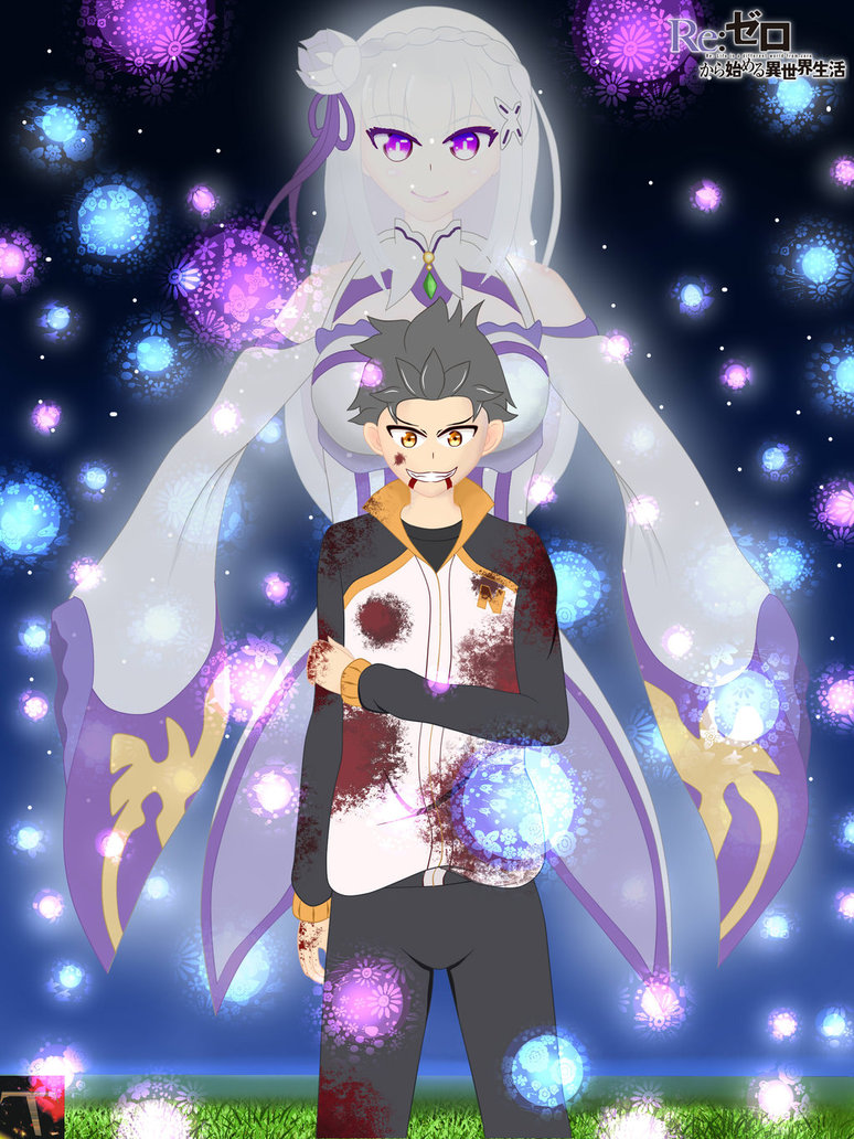 Description: A man and a woman standing in front of a blue sky with purple and white stars and a purple and white cat.
