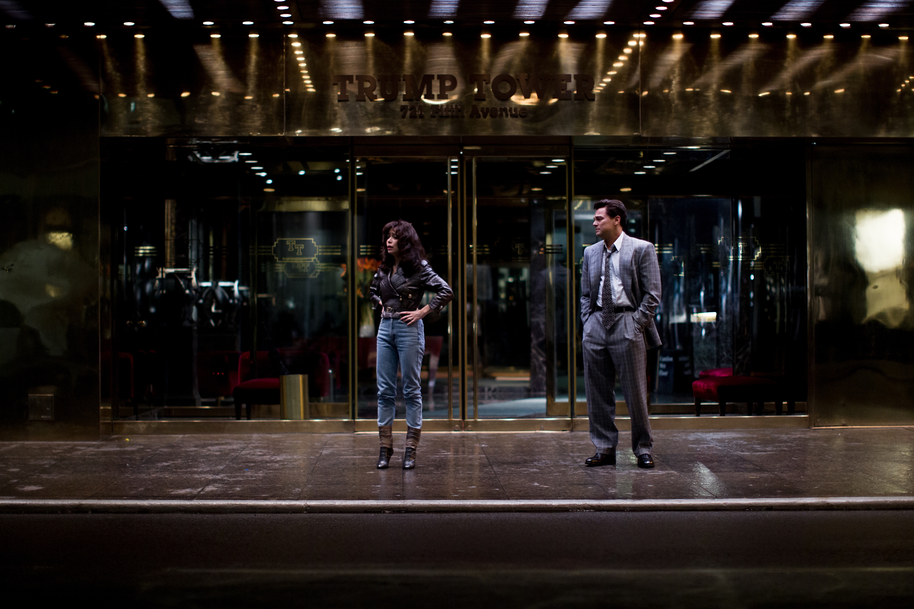 Description: A man and a woman standing in front of a building at night with lights on the doors and a woman standing in front of the door.