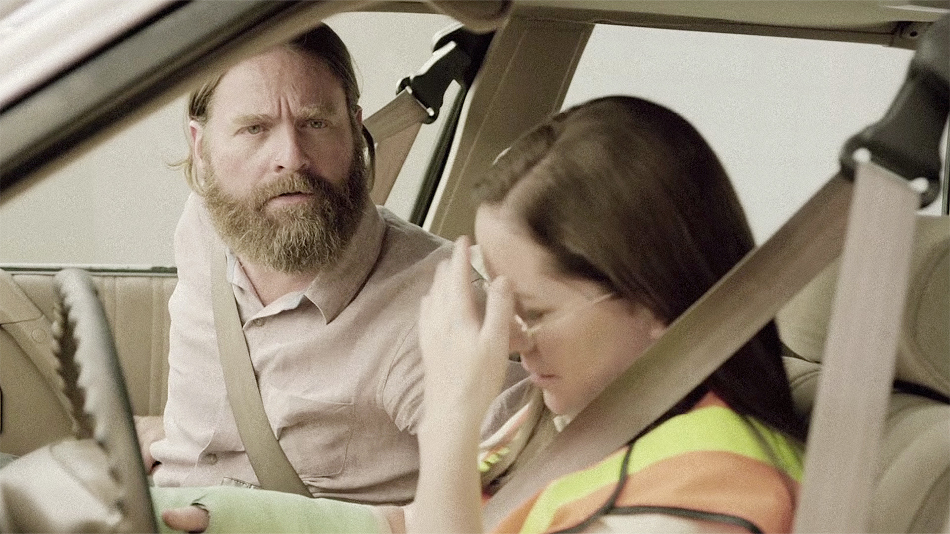 Description: A man and a woman sitting in a car looking at something on the phone while the woman is holding her head.