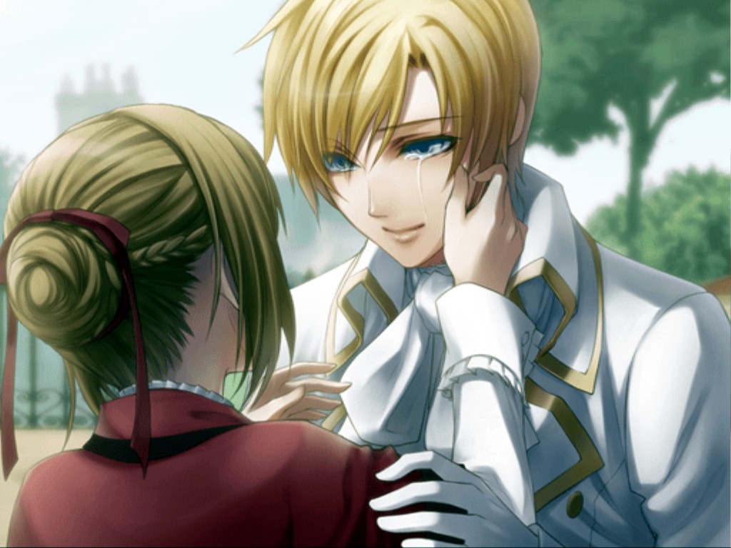 Description: A man and a woman are facing each other in a cartoon style picture with trees in the background and a sky in the background.