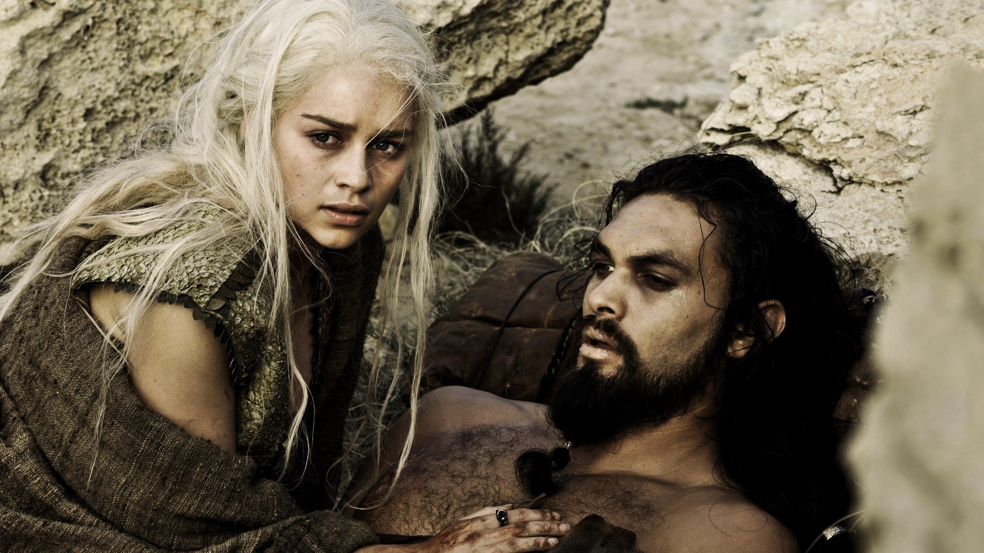 Description: A man and a woman in a cave with a stone wall behind them and a rock wall behind them.