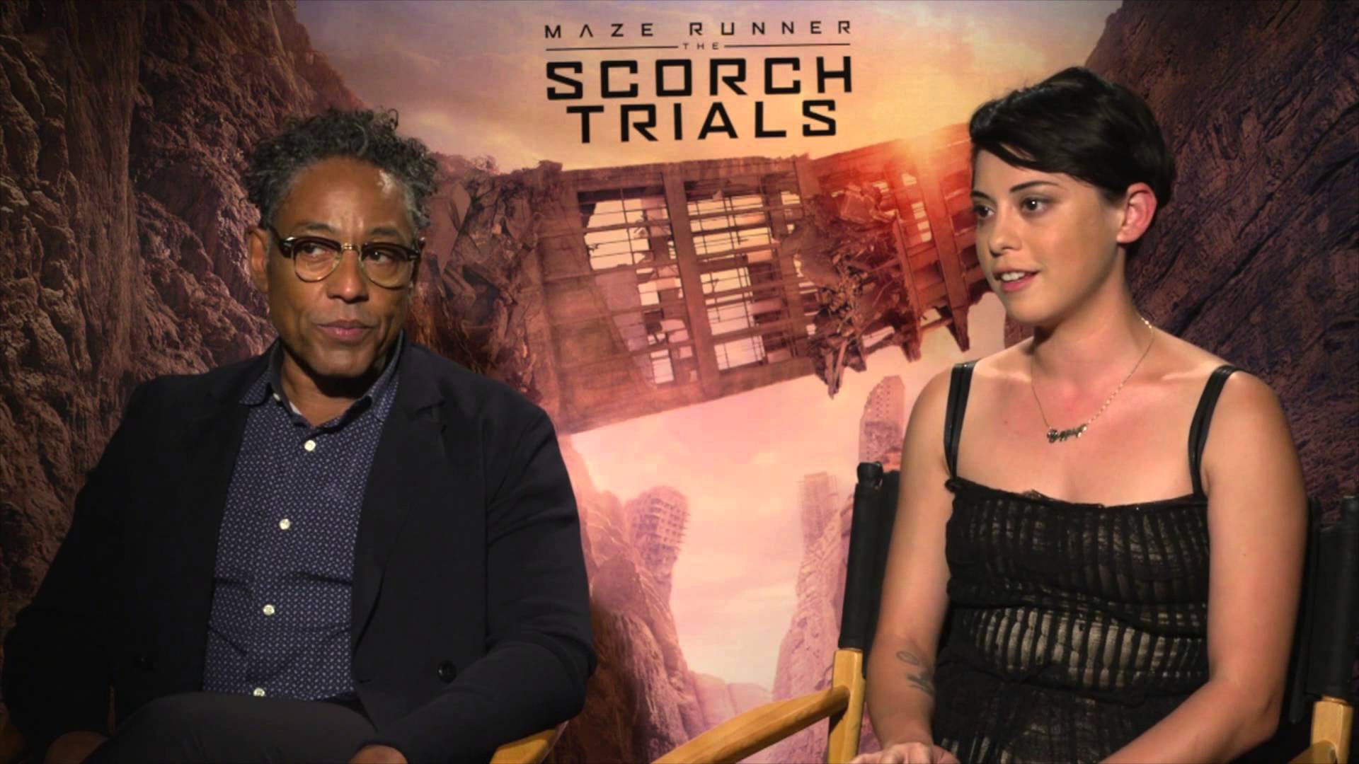 Description: A man and a woman sitting next to each other in chairs in front of a movie poster with a sci - fi theme.