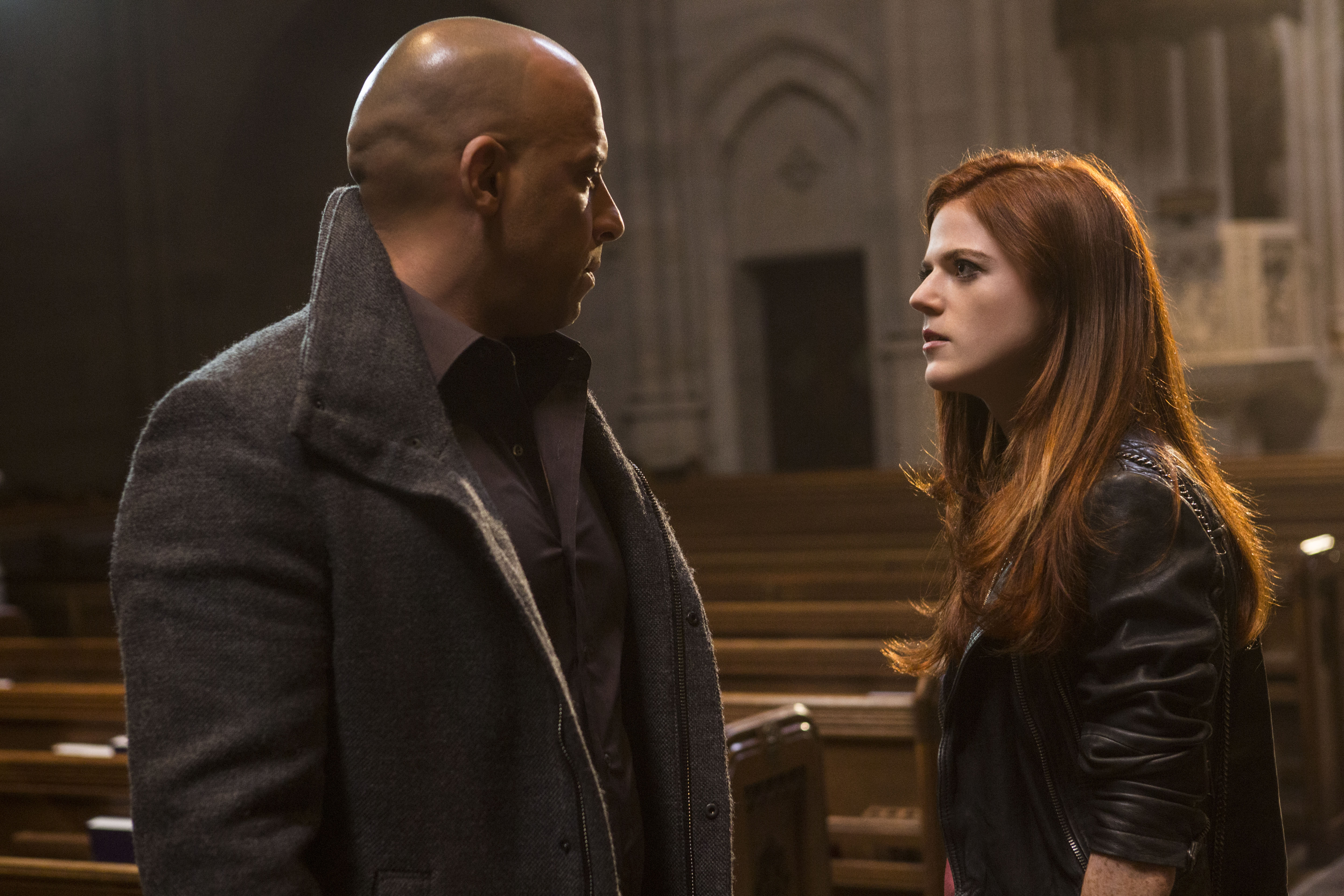 Description: A man and a woman standing in a church together looking at each other and talking to each other.