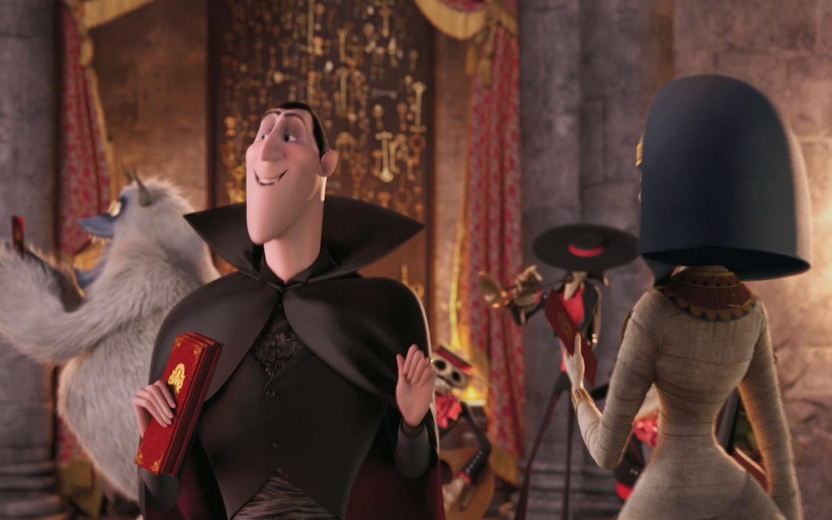 Description: A man and woman in costumes standing next to each other in a room with a ceiling fan and a ceiling fan.