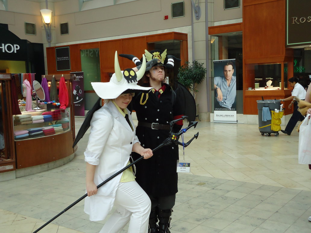 Description: A man and woman dressed in costumes holding swords in a mall area with people walking around the mall area.