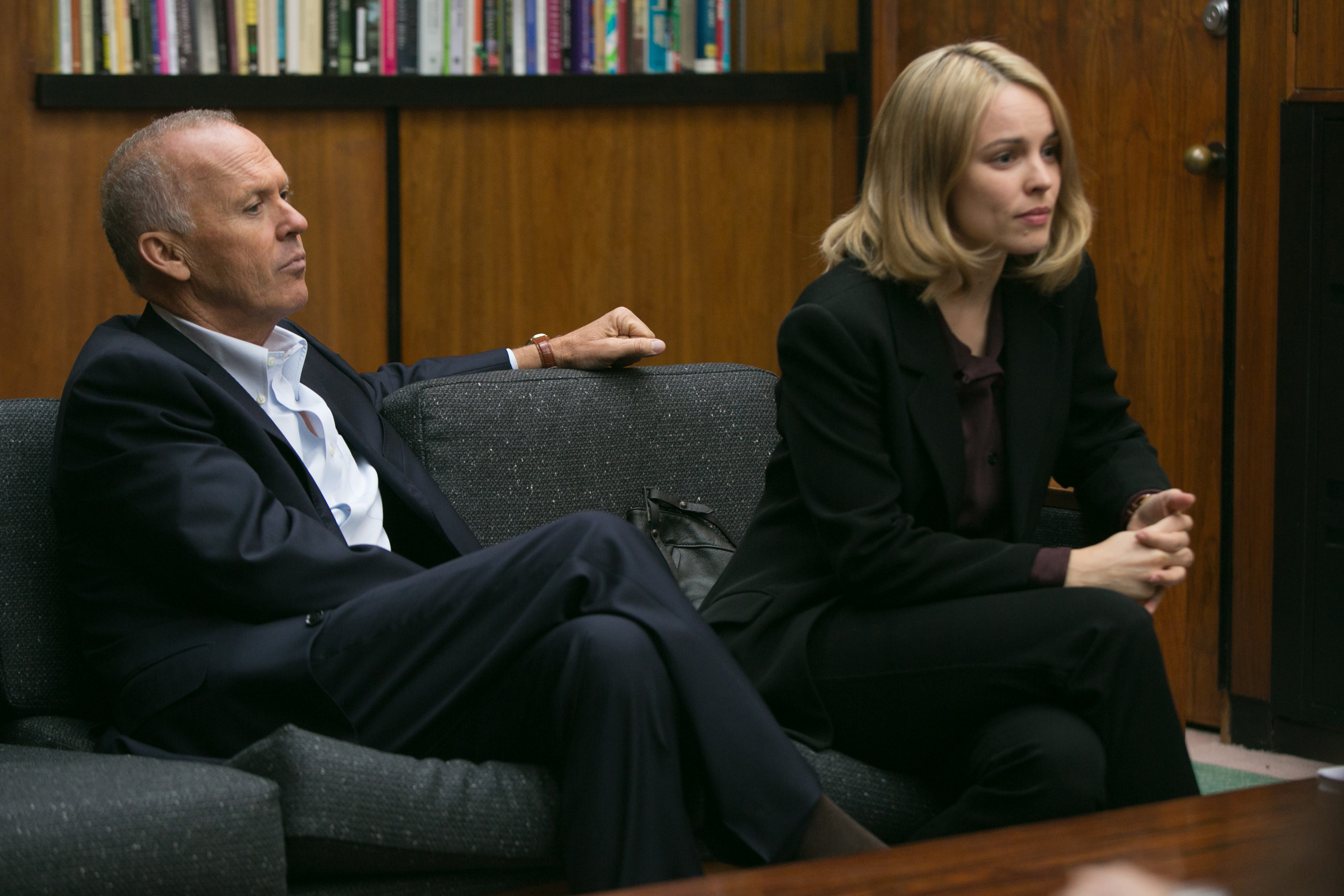 Description: A man and a woman sitting on a couch in a room with bookshelves and a bookcase.