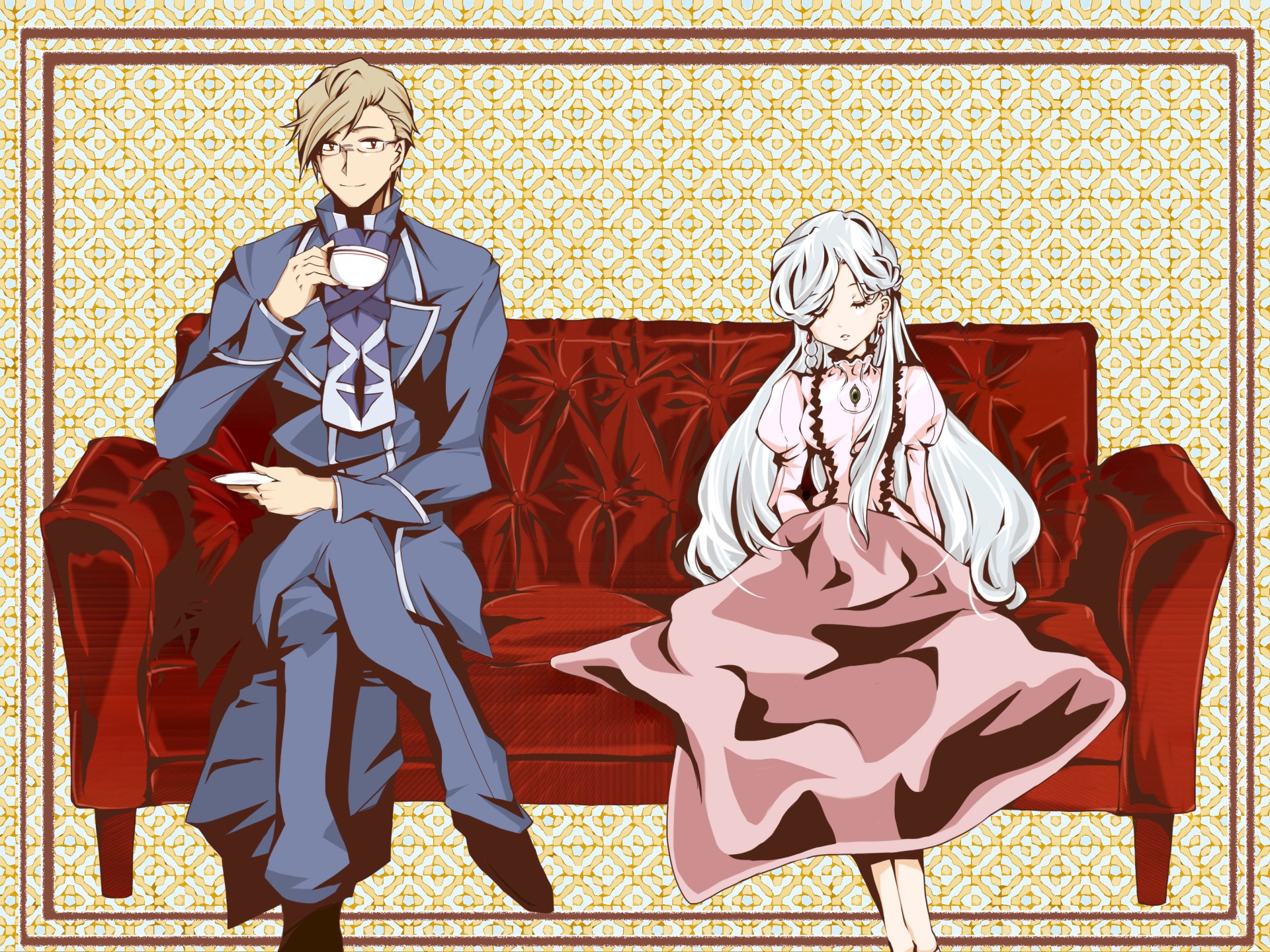 Description: A man and a woman sitting on a couch next to each other in front of a red couch with a red and yellow background.