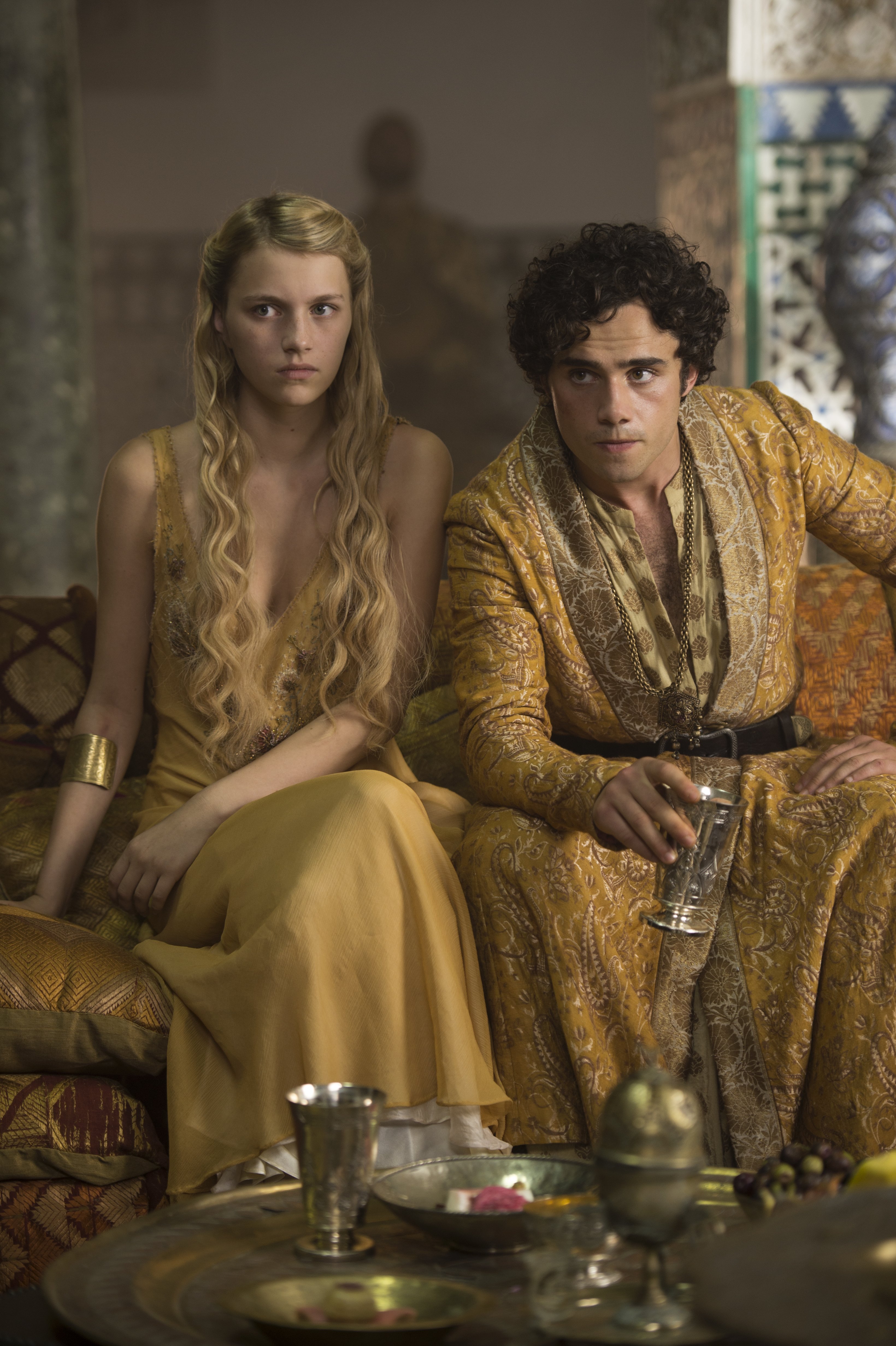 Description: A man and a woman sitting on a couch in a room with a table and a vase on it.