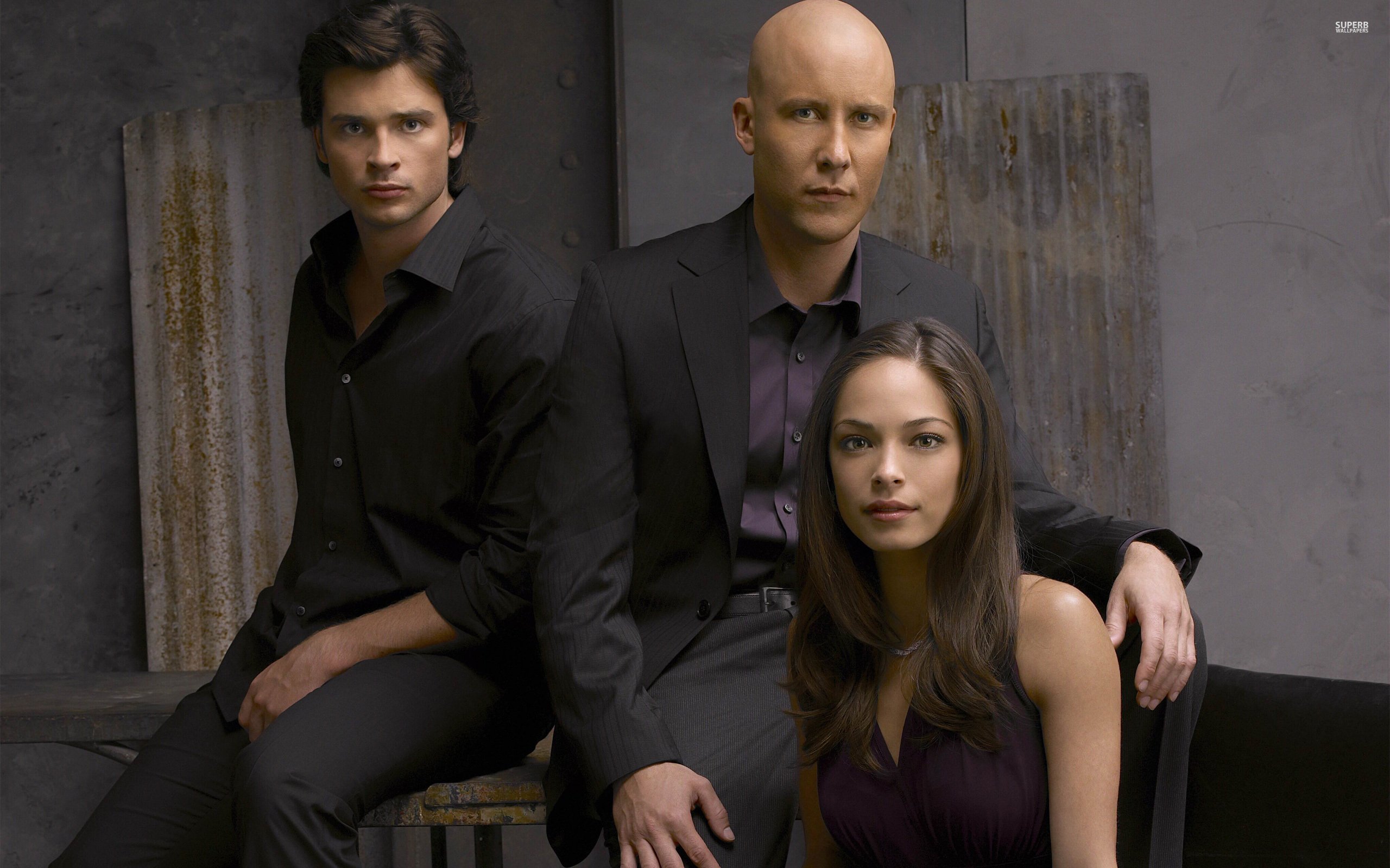 Description: A man and a woman sitting on a couch in a room with a wall behind them and a man in a suit and tie.