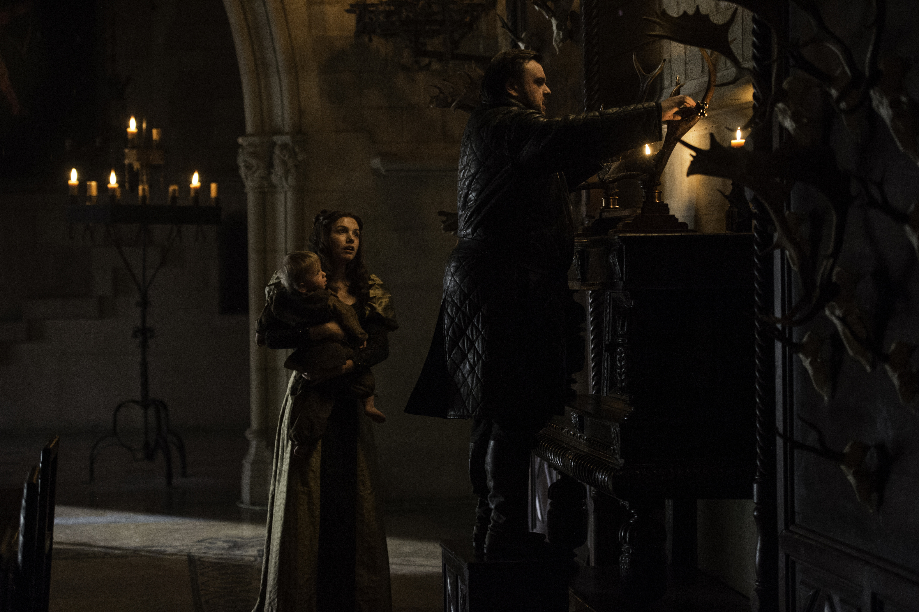 Description: A man and a woman in a dark room with candles on the wall and a clock on the wall.