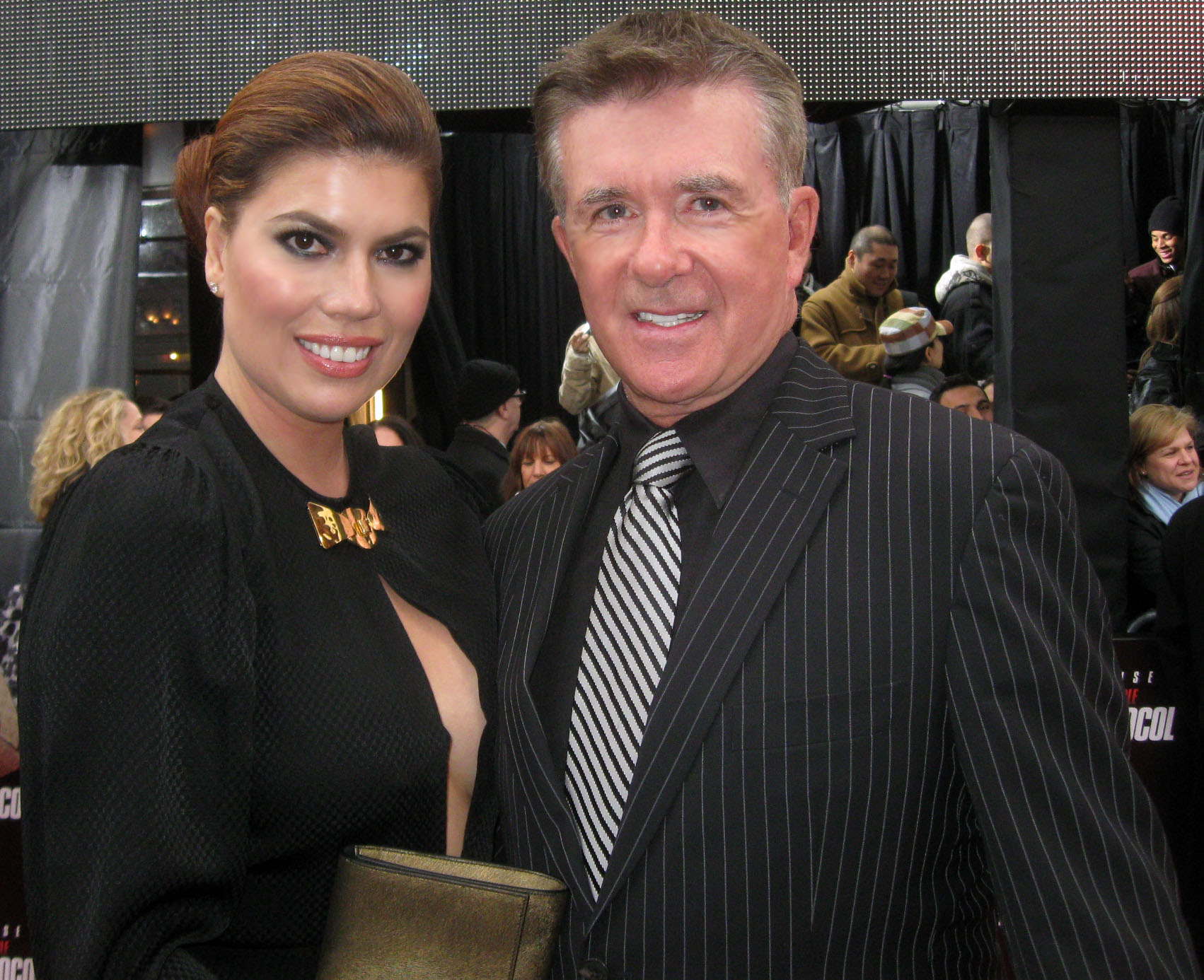 Description: A man and a woman posing for a picture together at an event with a crowd of people in the background.