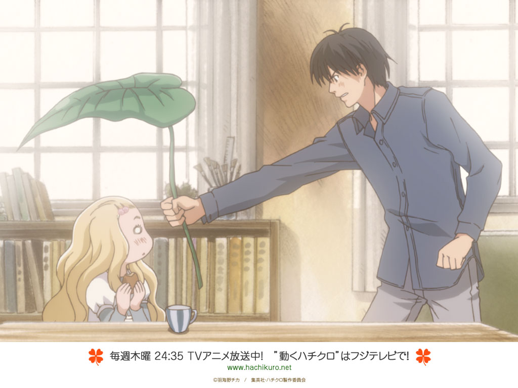 Description: A man is giving a woman a flower in a room with a bookcase and a window in the background.