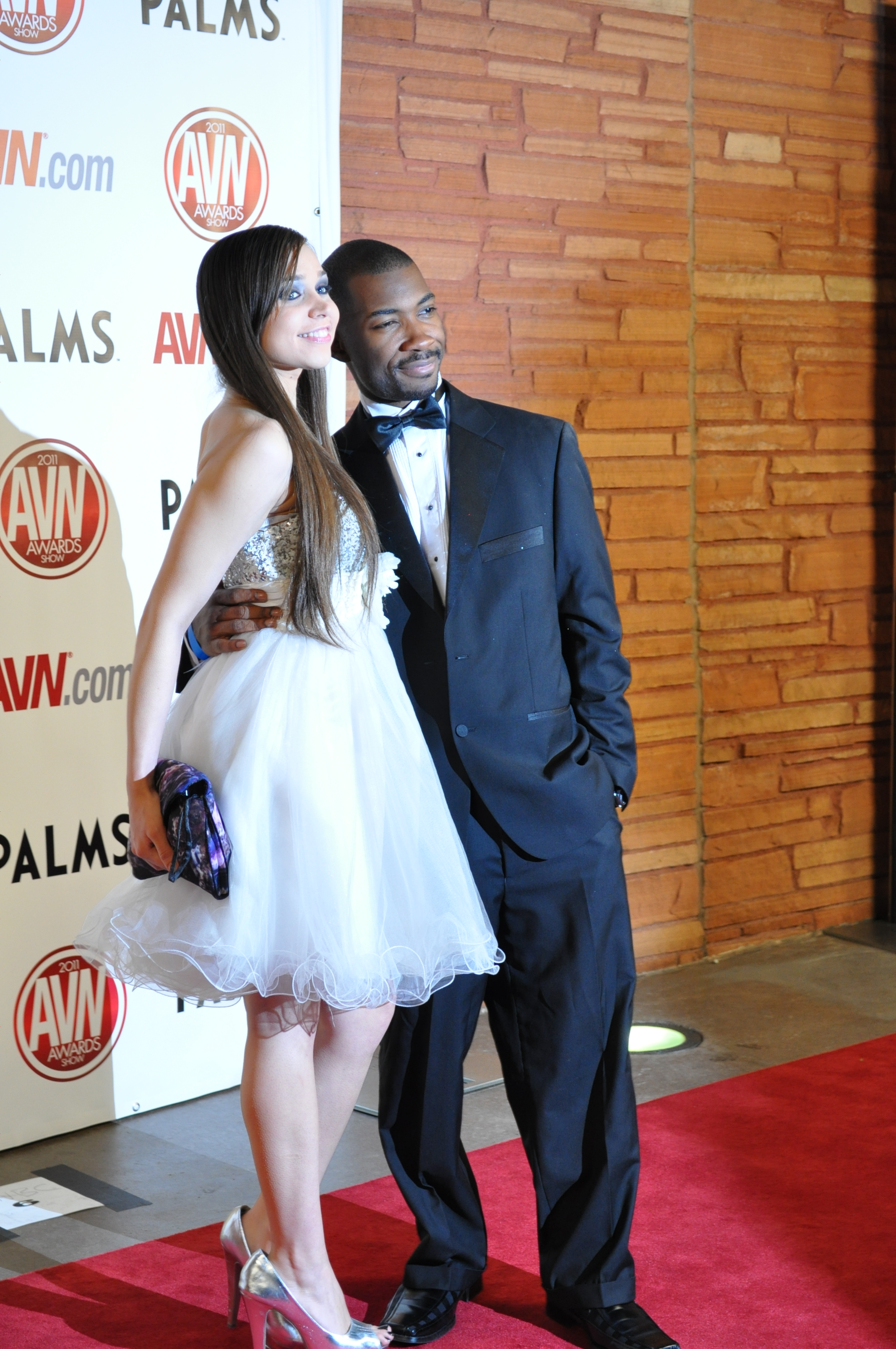 Description: A man and a woman in formal wear standing on a red carpet together.