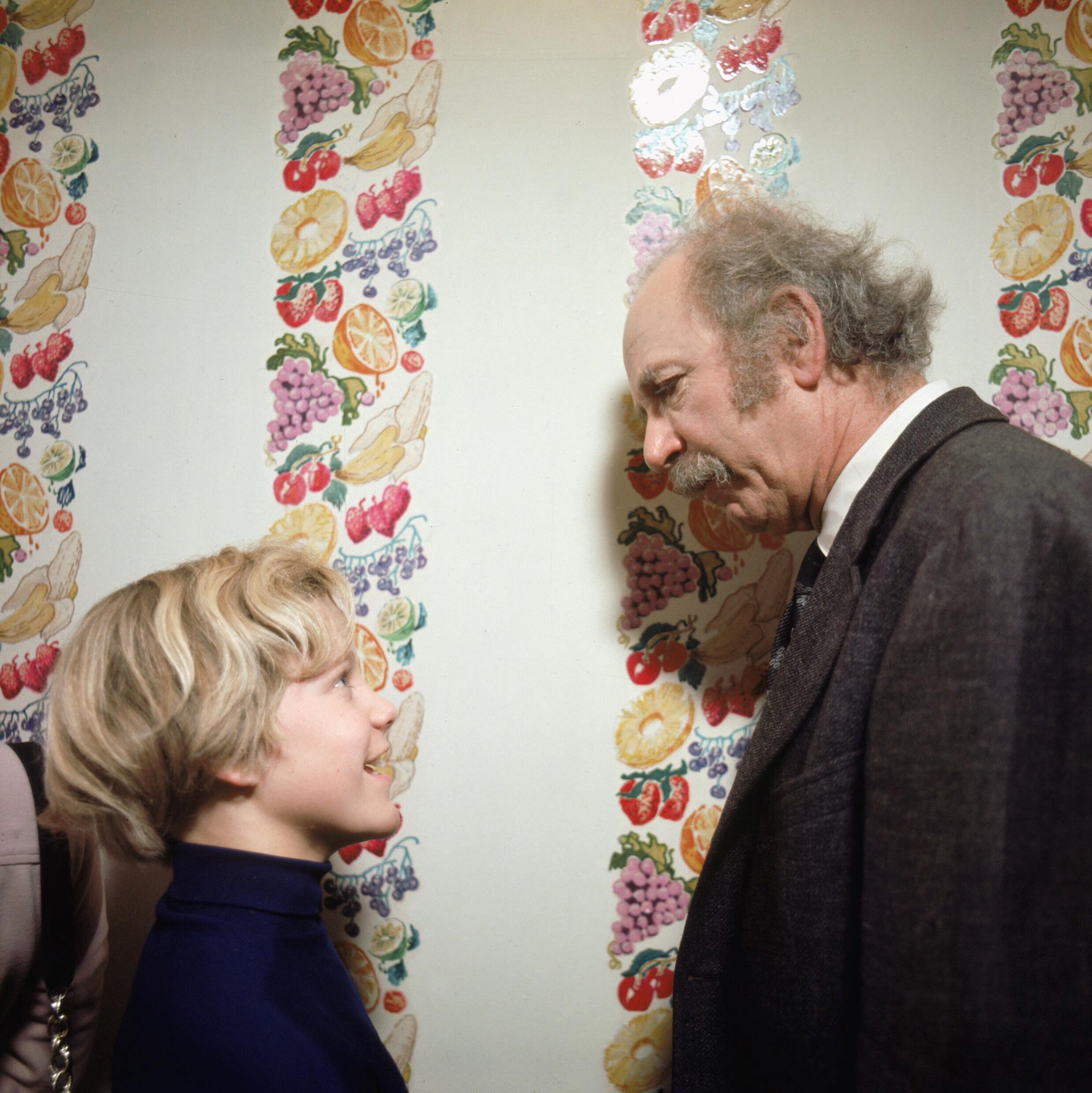 Description: A man and a woman standing next to each other in front of a wall with fruit designs on it.