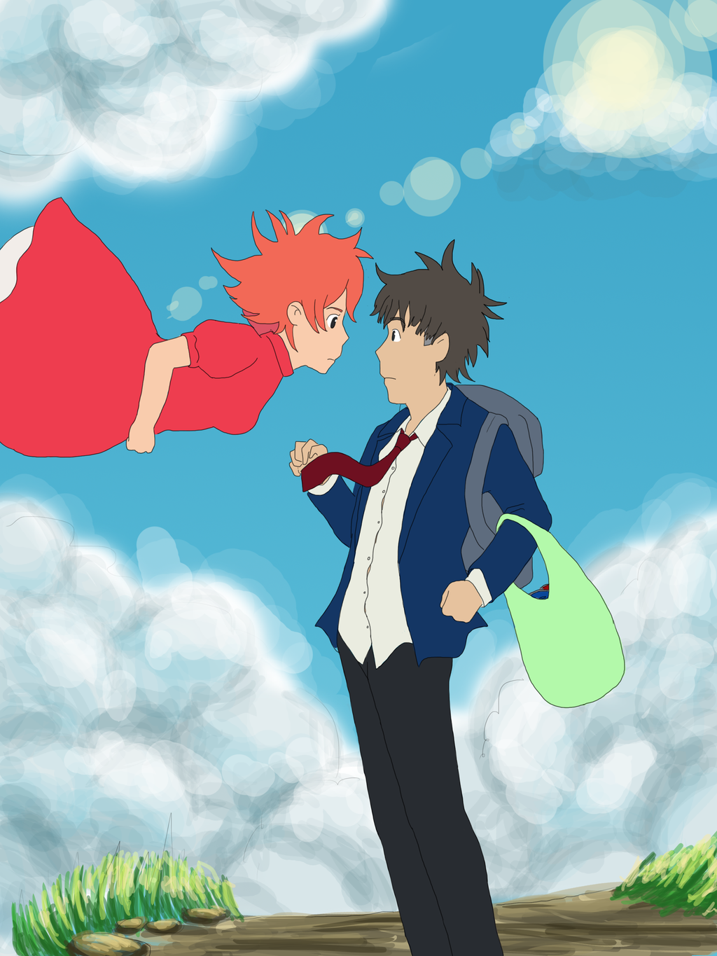 Description: A man and a woman are standing in the grass with a sky background and clouds behind them.
