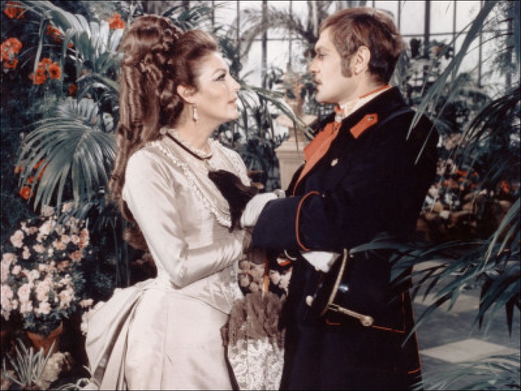 Description: A man and a woman in formal clothing standing in a greenhouse looking at each other and smiling at each other.