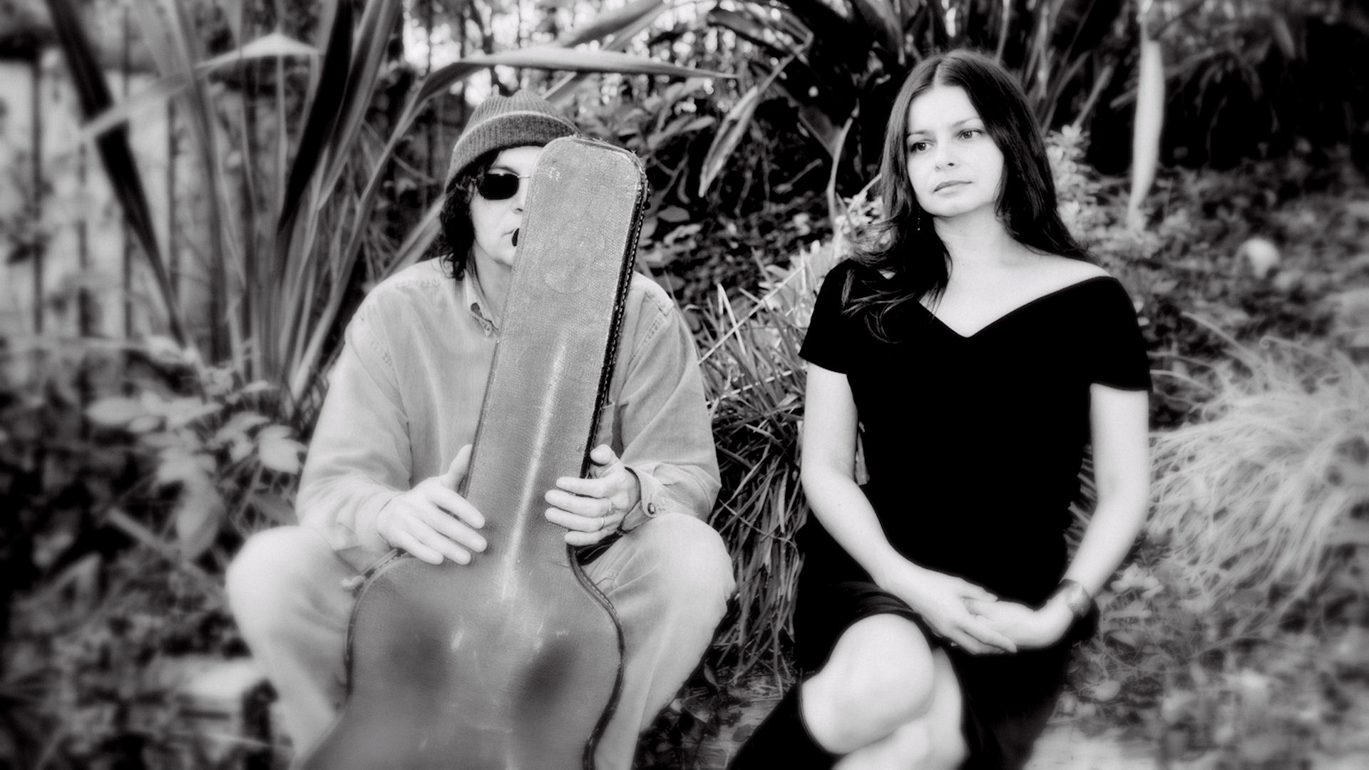 Description: A man and a woman sitting next to each other holding a guitar case in their hands and looking at the camera.