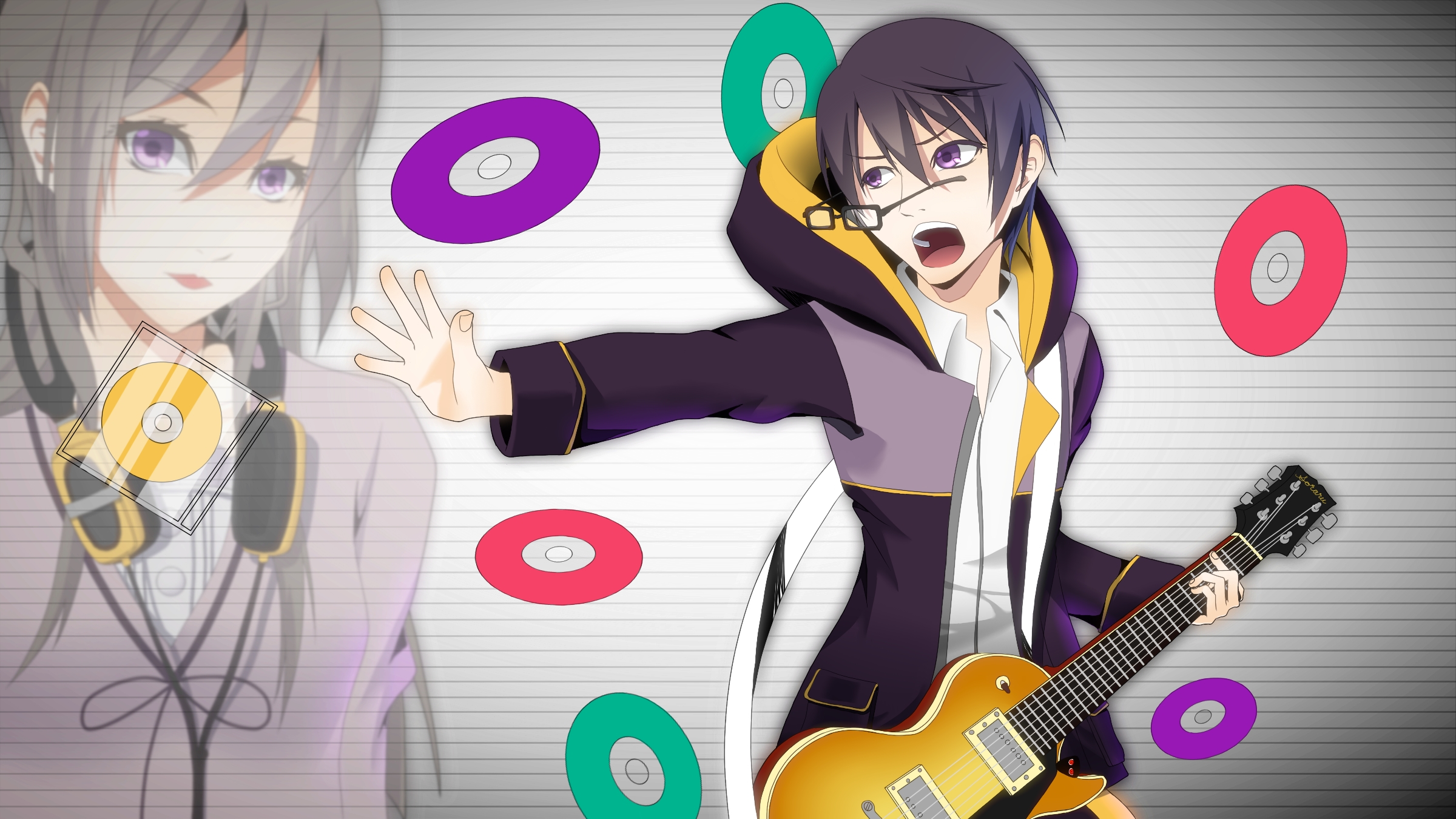 Description: A man and a woman with headphones and a guitar in front of a wall with music notes and circles.