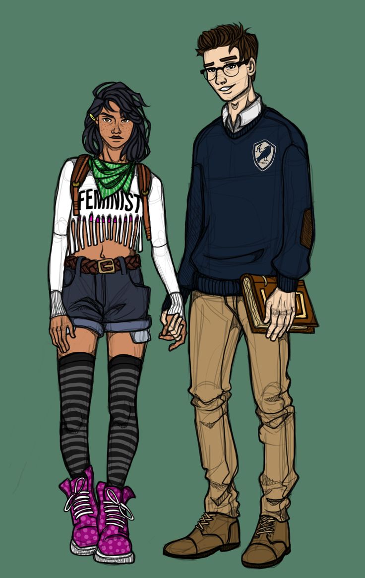Description: A man and a woman standing next to each other holding hands and wearing boots and sweaters.