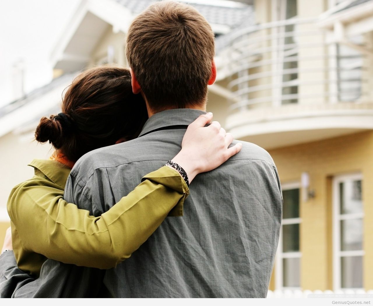 Description: A man and woman hugging in front of a house with a balcony on the second floor of the house.