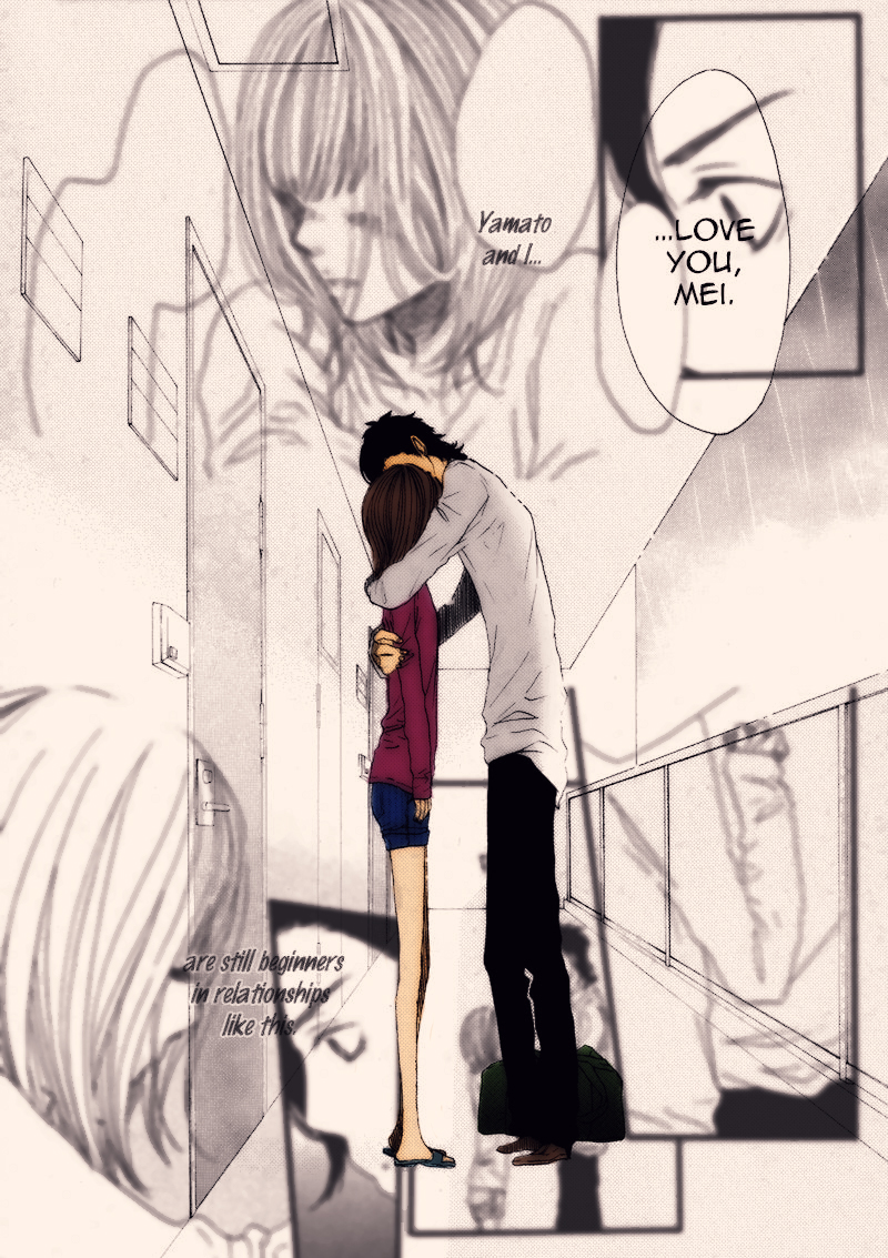 Description: A man and a woman hugging in a room with a window and a sign above them that says love.