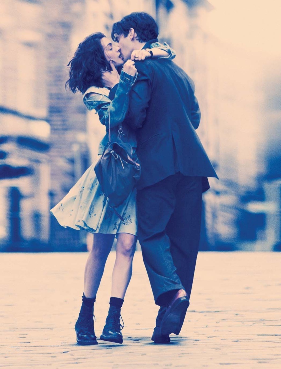 Description: A man and woman kissing on a city street with a building in the background and a blue sky in the background.
