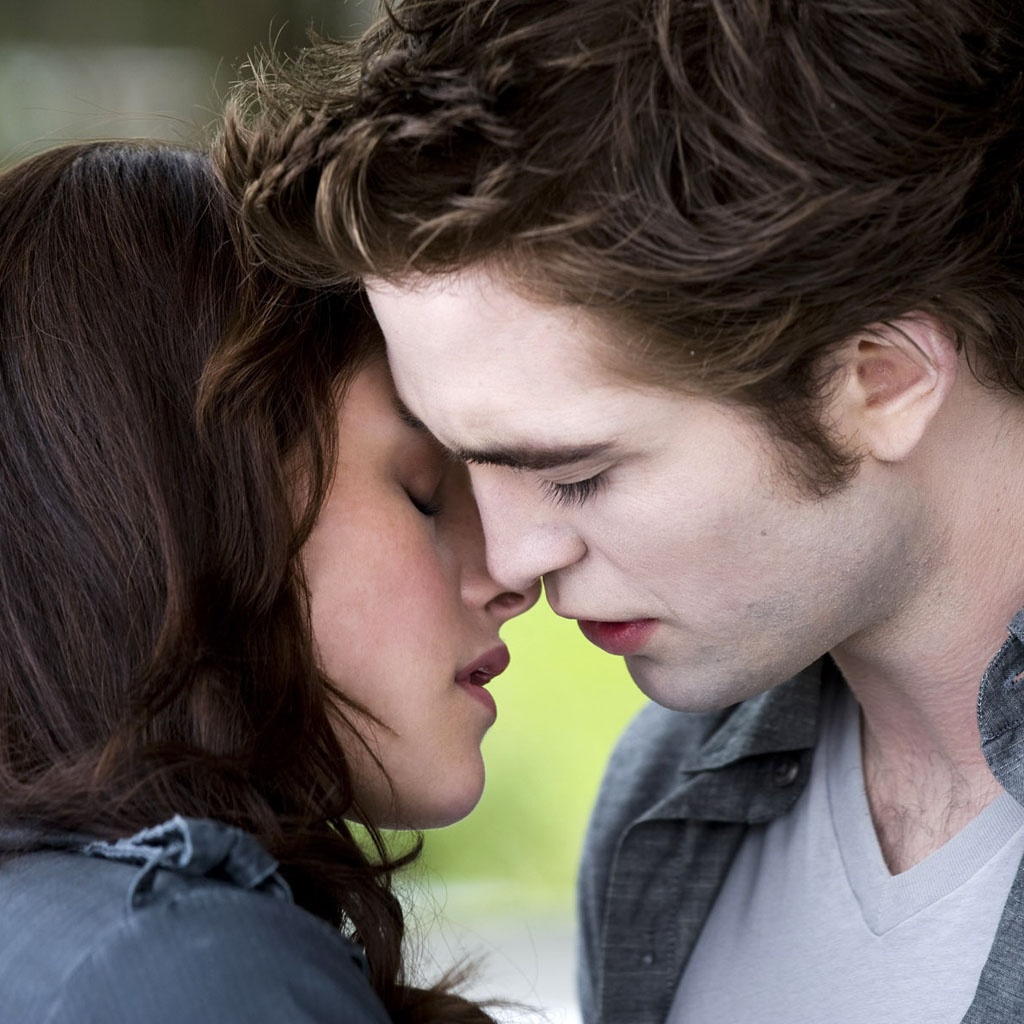 Description: A man and a woman kissing each other with their eyes closed and their noses close together.