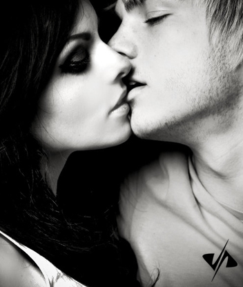 Description: A man and a woman kissing each other with their eyes closed and their noses close together.