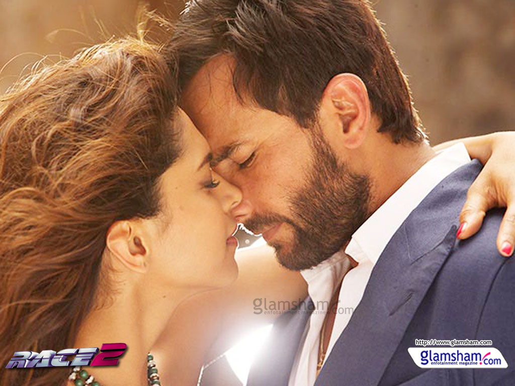 Description: A man and a woman are kissing in a scene from the movie race 3.
