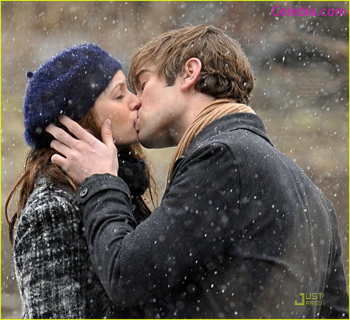 Description: A man and woman kissing in the snow with a hat on their head and a scarf on their head.