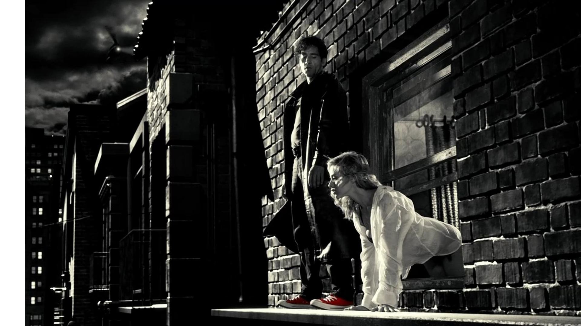 Description: A man and a woman standing on a ledge in front of a brick building with a red shoe on.
