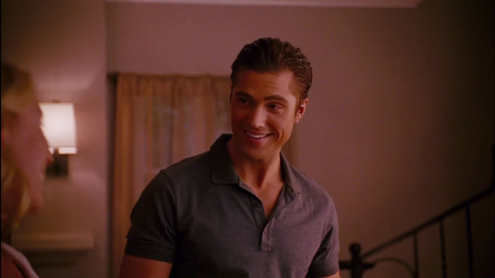 Description: A man standing in a living room next to a woman in a dress shirt and a lamp on a wall.
