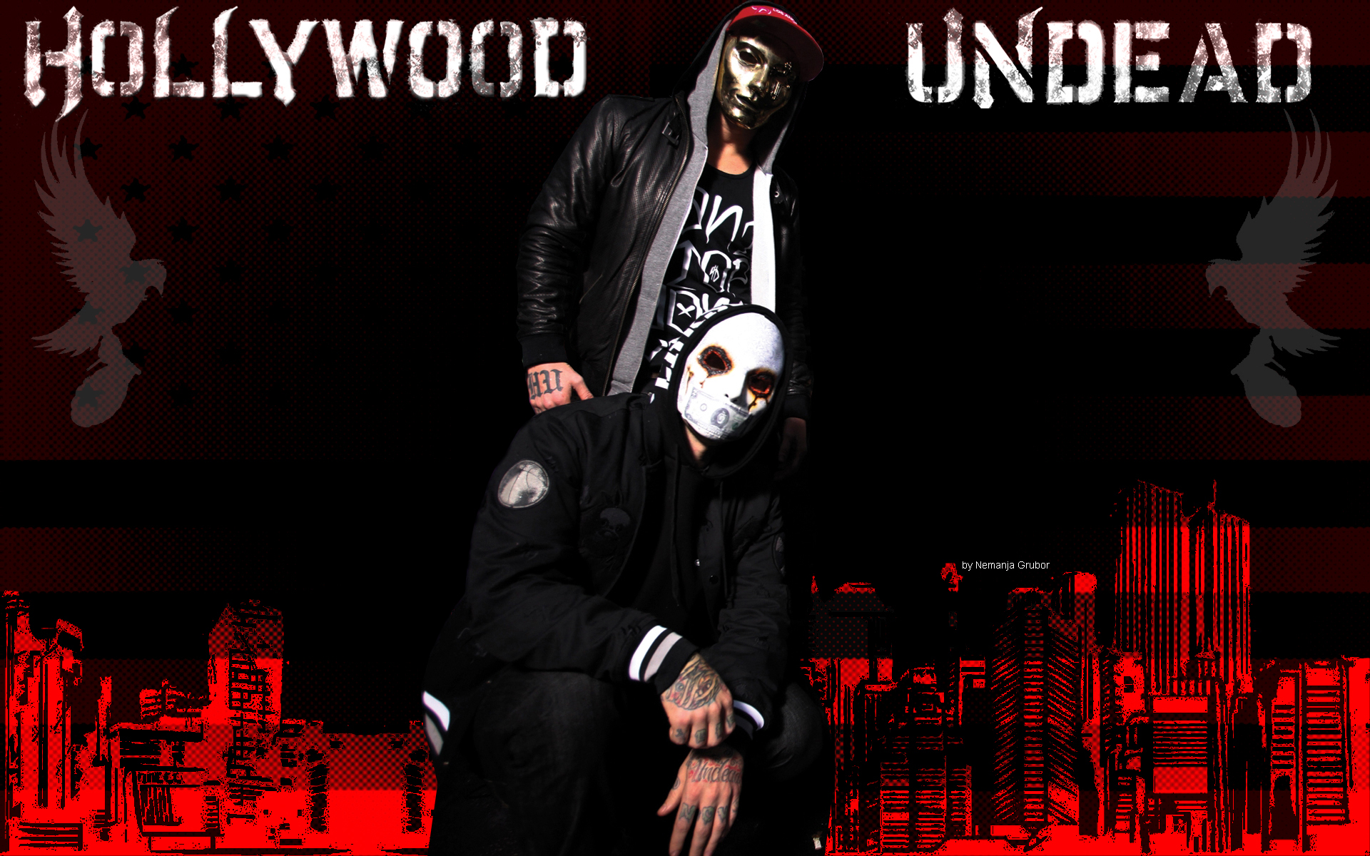 Description: A man and a woman in masks standing next to each other in front of a city skyline with a red background.