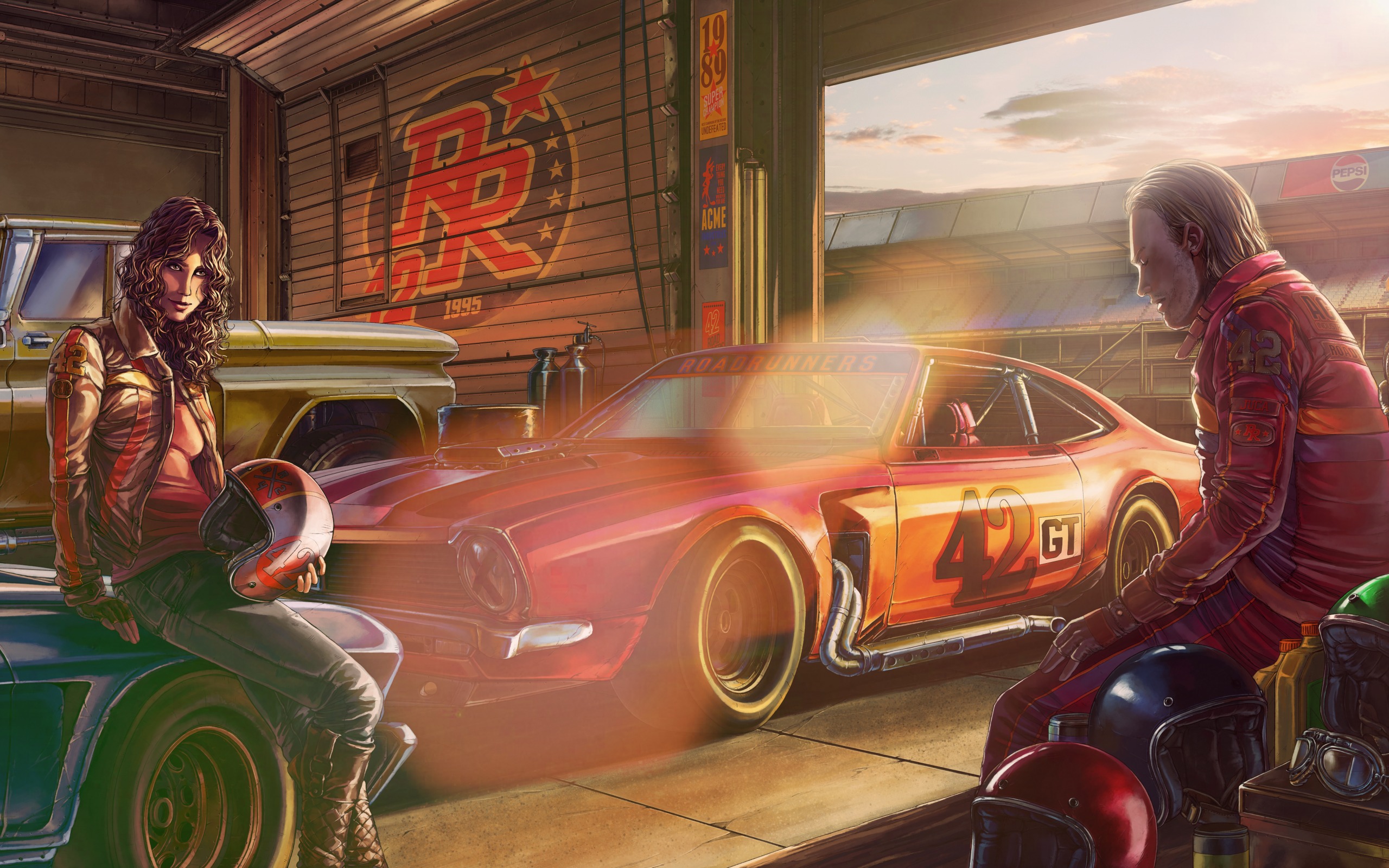 Description: A man and a woman sitting on a motorcycle in a garage next to a car and a neon sign.