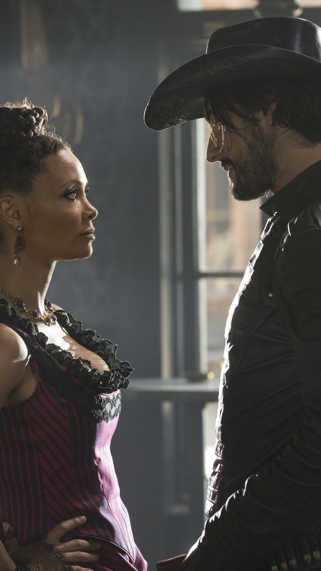 Description: A man and a woman dressed in period costumes talking to each other in a room with a window behind them.