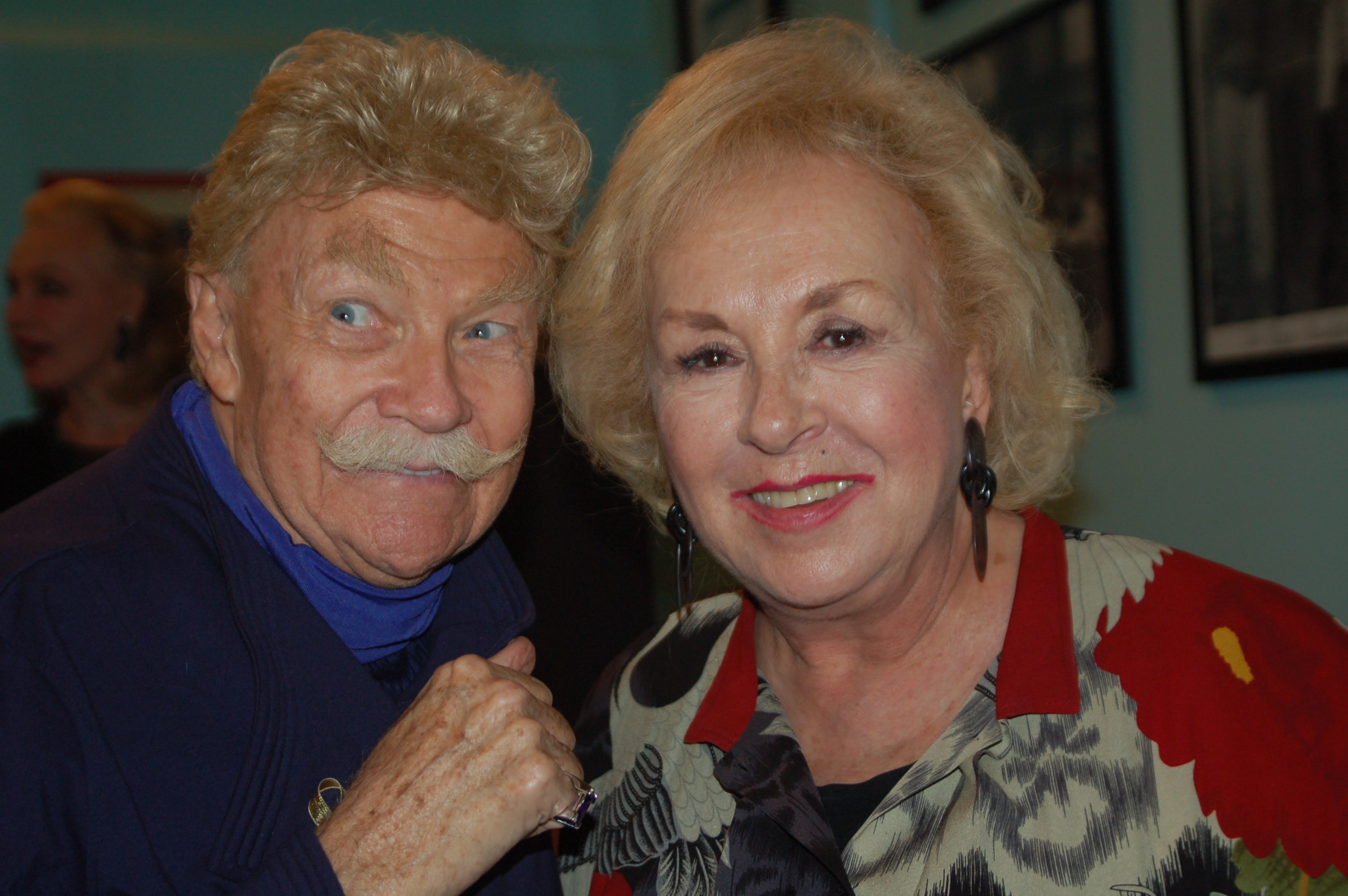 Description: A man and woman posing for a picture together in a room with pictures on the wall behind them and a man with a mustache.
