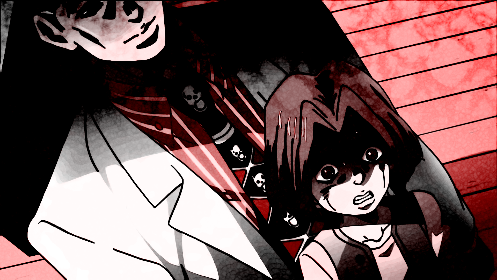 Description: A drawing of a man and a woman standing next to each other on a red background with a black and white background.