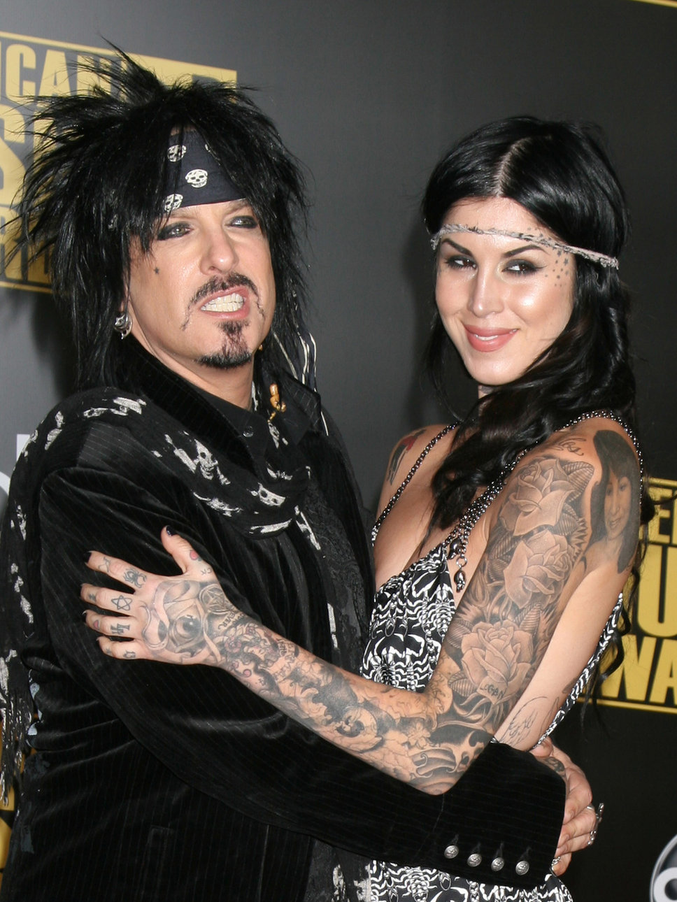 Description: A man and a woman posing for a picture together on the red carpet of an event with tattoos on their arms.