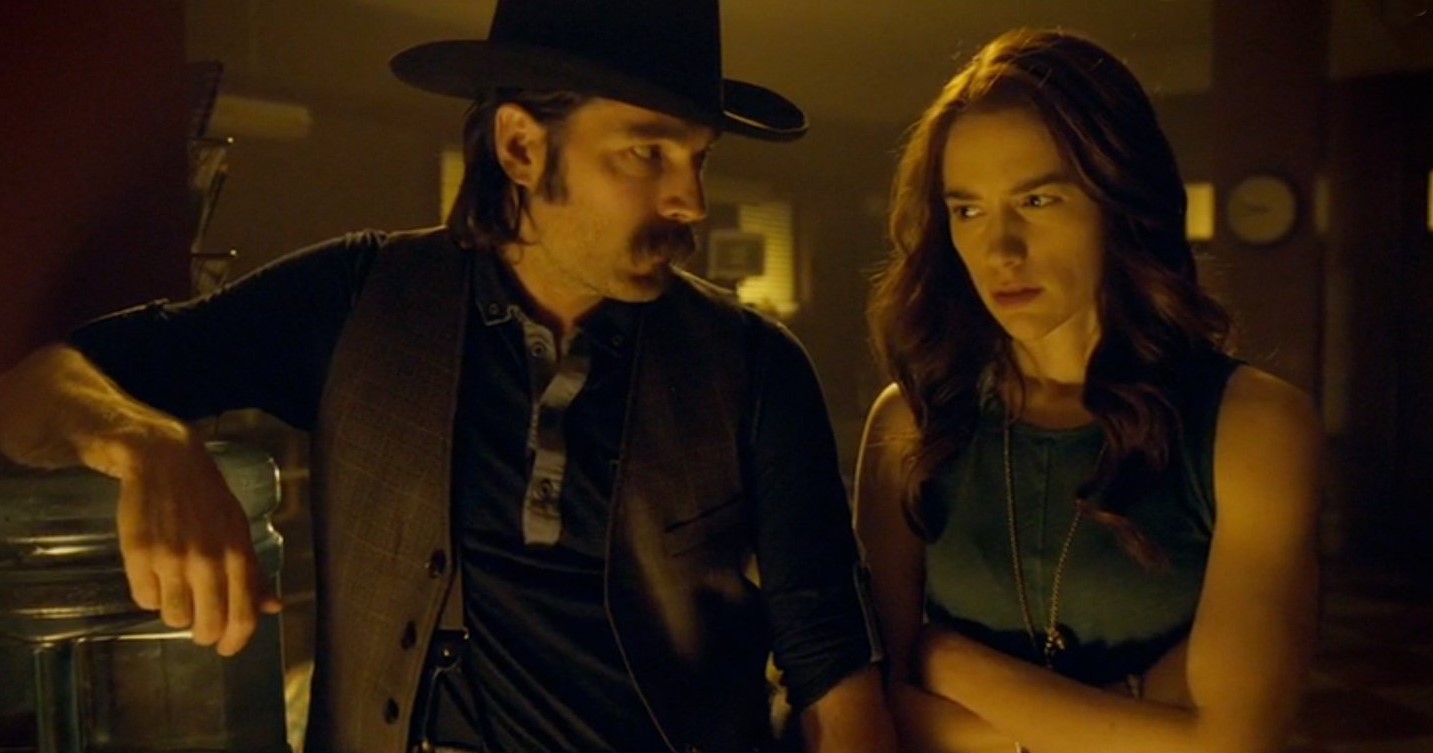 Description: A man and a woman standing next to each other in a room with a clock on the wall and a man in a hat.