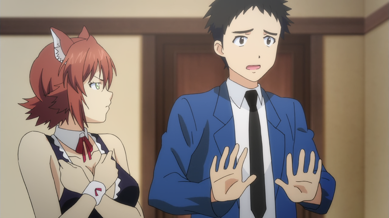 Description: A man and a woman standing next to each other in a room with a door open and one woman wearing a blue suit.