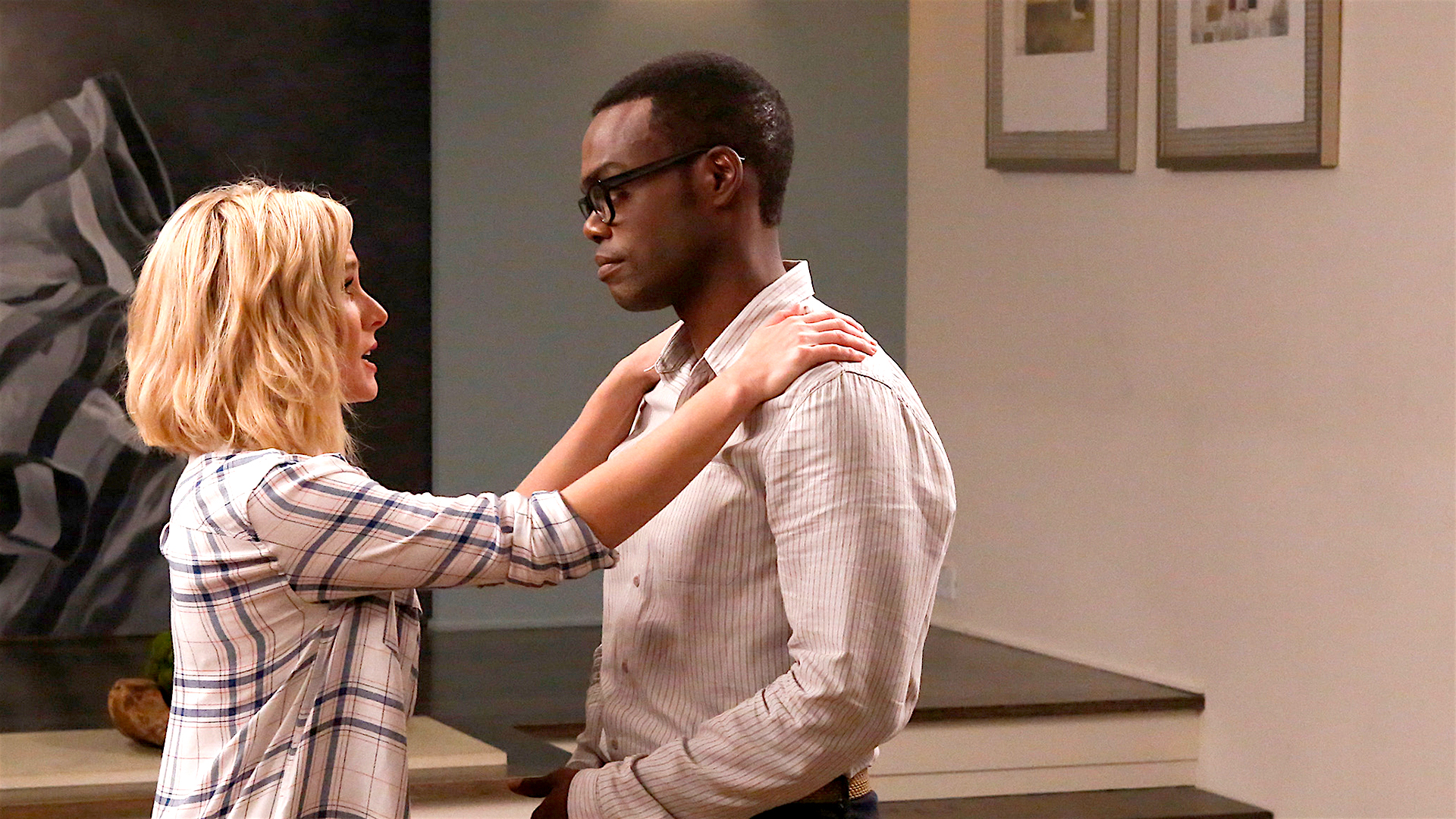 Description: A man and a woman standing in a room together.